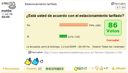 Para cerrar este informe no podía ser de otro modo que con una encuesta acerca del tema, que activó en este caso el usuario "matiba" el 1 oct 09, cerrando el 11 oct 09, y con resultados muy sugestivos en relación al pensamiento general, mostrando la misma solo un 21% a favor del estacionamiento tarifado, y un 79% en contra del mismo (ver imagen ilustrativa).
